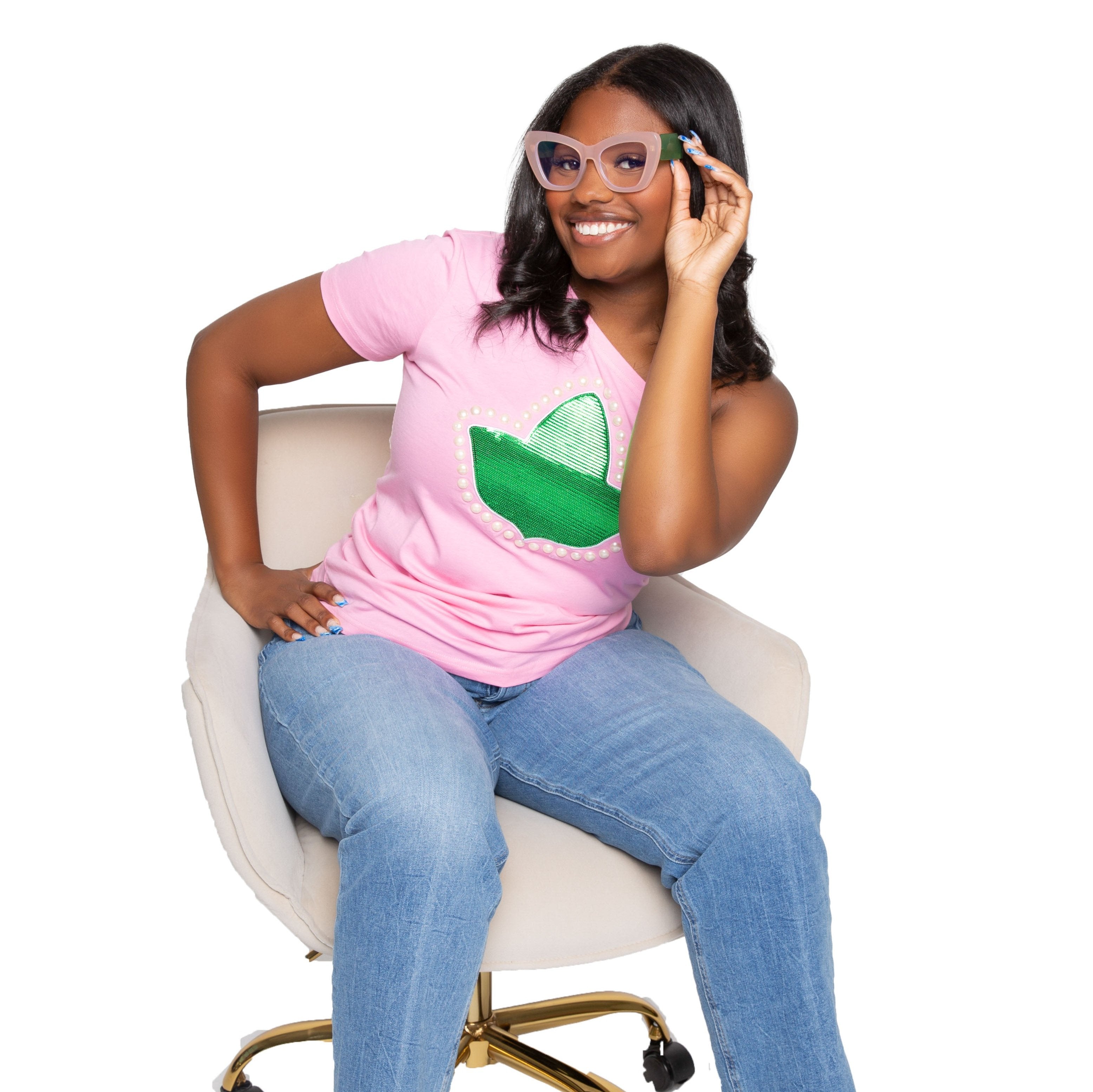 The product is a stylish pink tee shirt featuring an one-shoulder design. Central to the design showcases a green ivy leaf, which is outlined by pearls. The ivy and pearls are intricately embroidered, adding a touch of elegance to the shirt.