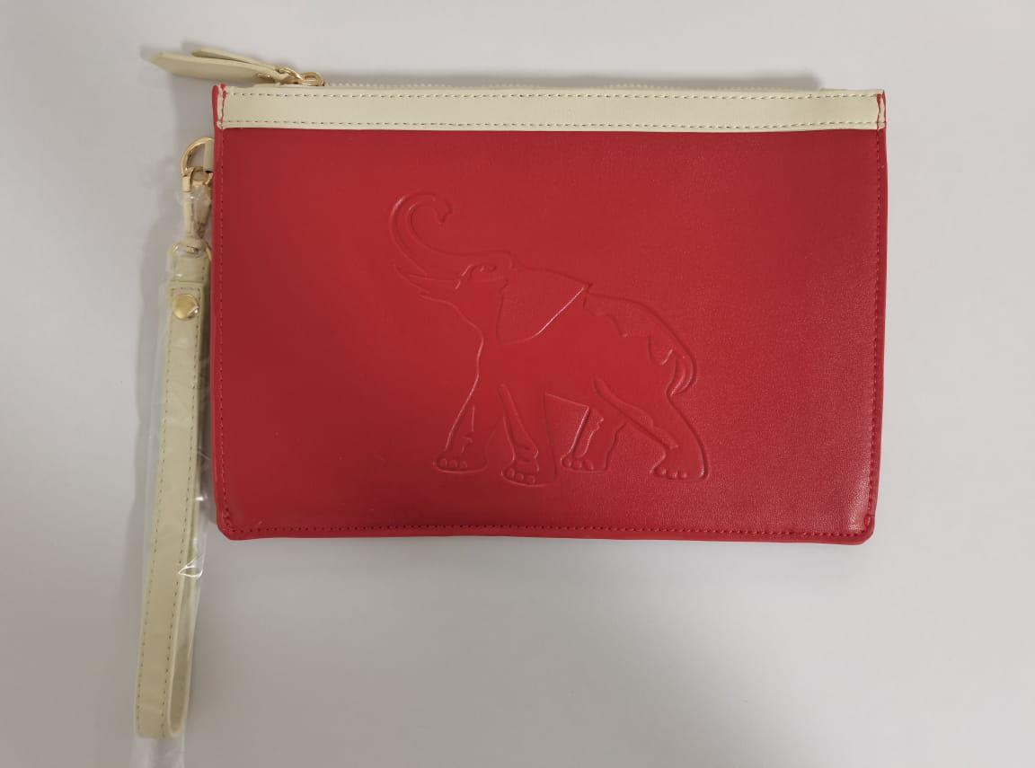 Elevate your accessories collection with this striking red and cream wristlet clutch. Crafted from high-quality faux leather, the standout feature is a beautifully embossed elephant design on the front—symbolizing strength, wisdom, and elegance. The top zip closure keeps your essentials secure, while the detachable cream wrist strap offers versatile carrying options. Whether you’re attending a special event or running errands, this stylish and compact bag adds a bold, meaningful touch to any outfit.